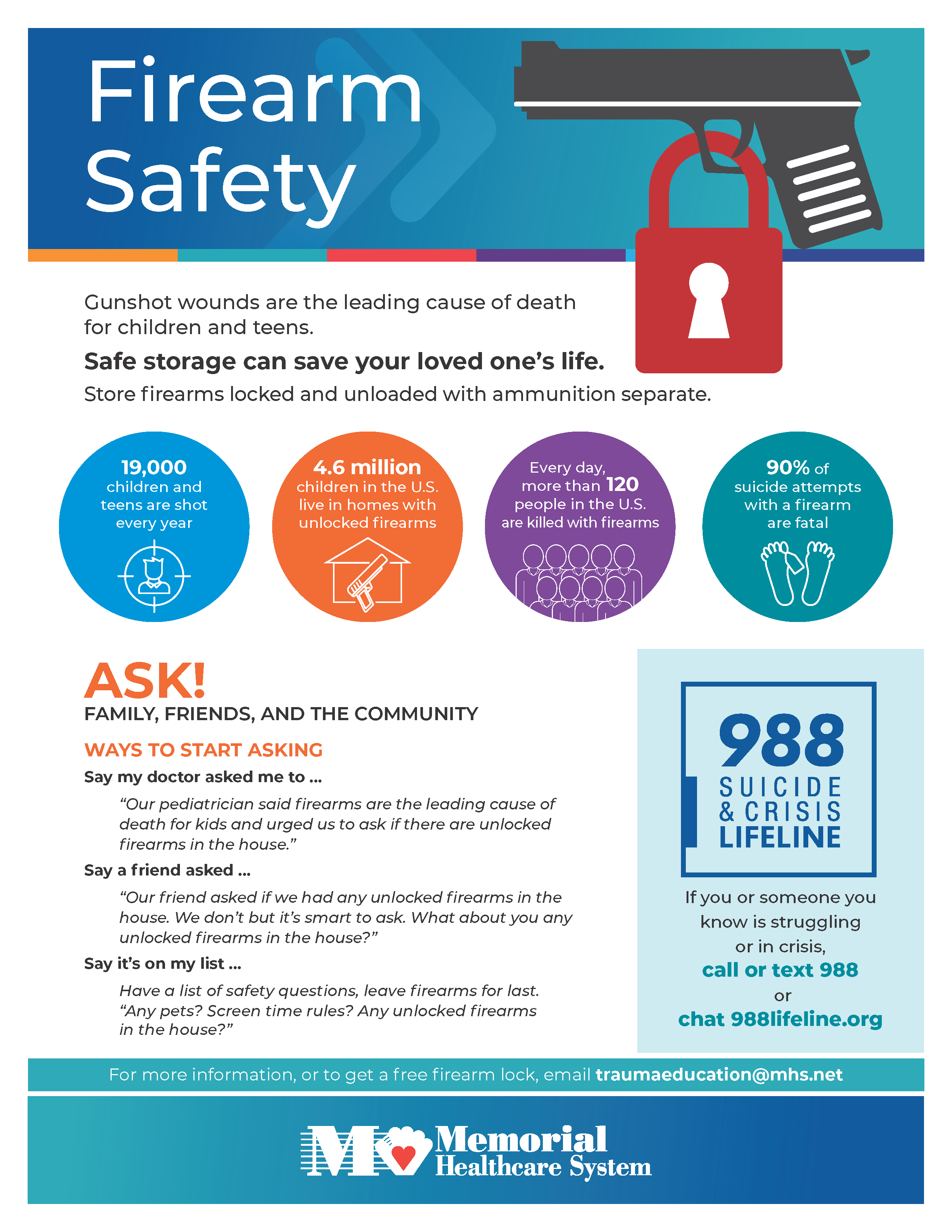 “So far this year, more than 5,300 people have died by gunshot wound in the United States. Many of these deaths have happened in Florida,” says Candace M. Pineda, MBA, BSN, RN, TCRN, senior director of Trauma and Acute Care Surgery. “Gunshots are the leading cause of death among children and teens. At Memorial, we’re dedicated to improving education around firearm safety and providing resources that can reduce danger.”